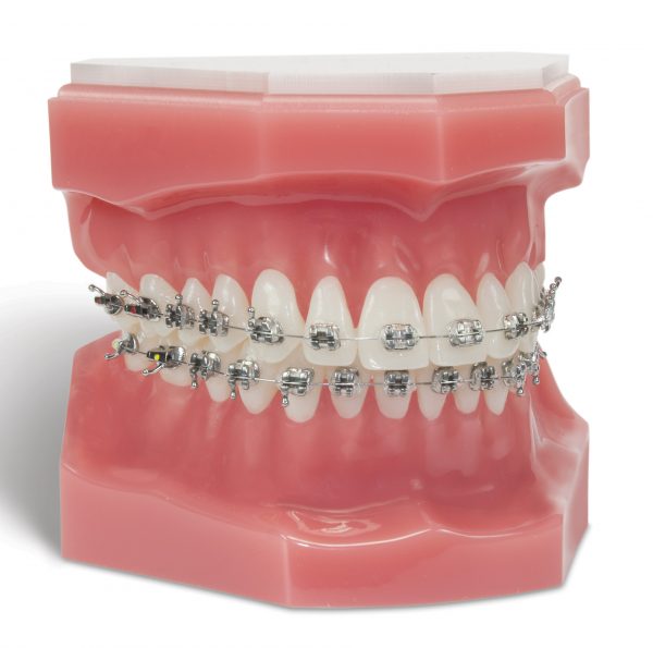 Bonded 7 to 7 with archwires, buccal tubes on upper and lower first and second molars, and clear ligatures in place. Gingiva-colored solid tissue base with tooth tone colored teeth molded separately and inserted in place prior to bonding. The high quality detail makes these hinged typodonts the perfect presentation aid. All typodonts arrive in a hard plastic case with foam insert perfect for safe, protective storage.